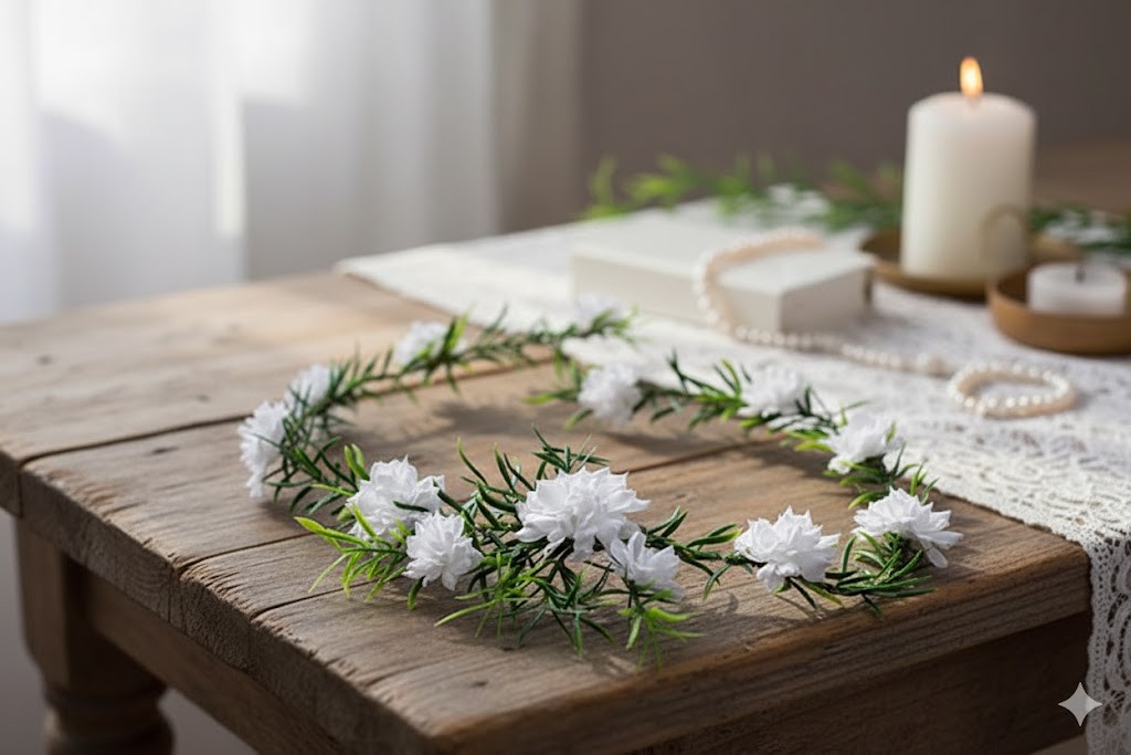 Może być delikatnie wpleciona lub ułożona jako subtelny akcent dekoracyjny.
