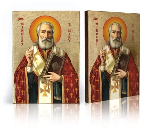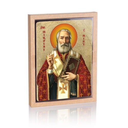 Na ikonie znajduje się wizerunek Świętego Mikołaja. Wszystkie ikony dostępne w naszej ofercie wykonane są z najwyższej jakości materiałów. Drewno wykorzystywane do produkcji ikon dobierane jest w niezwykle staranny sposób. Wizerunek naniesiony na ręcznie złoconą deskę. Produkt wspaniale sprawdzi się jako jedyny w swoim rodzaju upominek dla najbliższych.