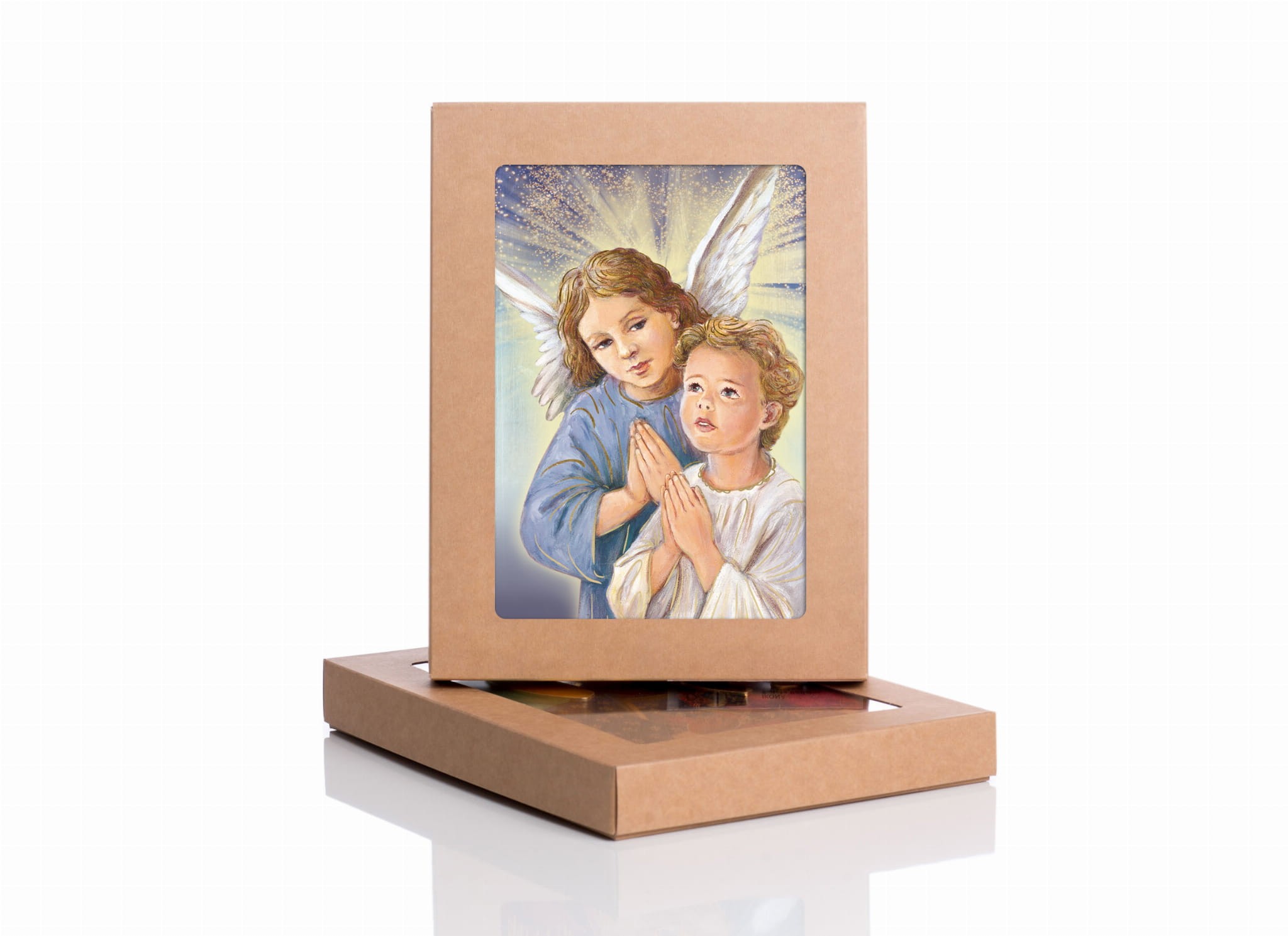 Ręcznie wykończona, piękna i kolorowa ikona wykonana na desce olchowej, ręcznie złocona złotem płatkowym. Ikona wykonana jest unikalną technologią nanoszenia obrazu na drewno. Dopełnieniem Ikony Anioła jest eleganckie pudełko , w które pakujemy wszystkie nasze ikony.