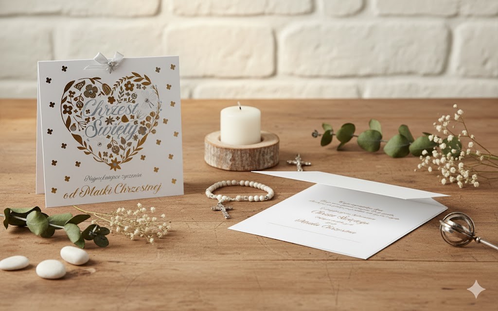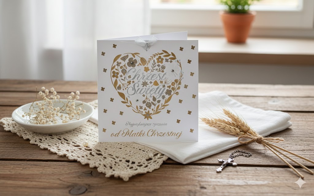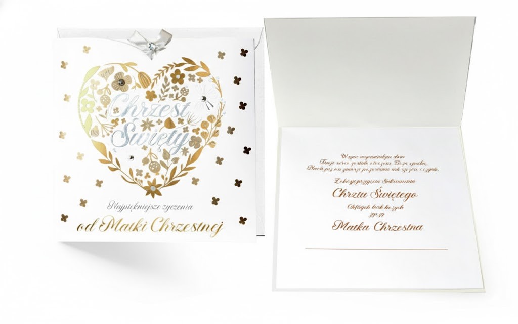 Ten elegancki karnet z życzeniami został zaprojektowany specjalnie dla Matki Chrzestnej, która w dniu Chrztu Świętego podejmuje ważną i piękną misję — wspierania dziecka na drodze wiary. To nie jest zwykła kartka, lecz wartościowa pamiątka, która po latach przypomni o miłości, obecności i modlitwie, jaką Matka Chrzestna otoczyła swoje Chrześniątko.