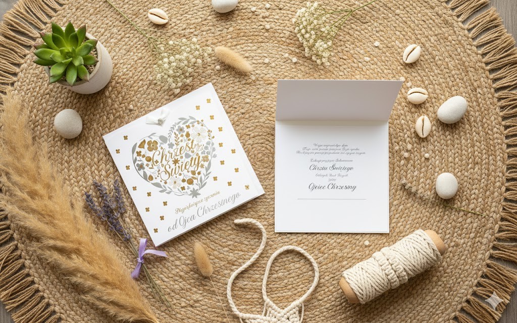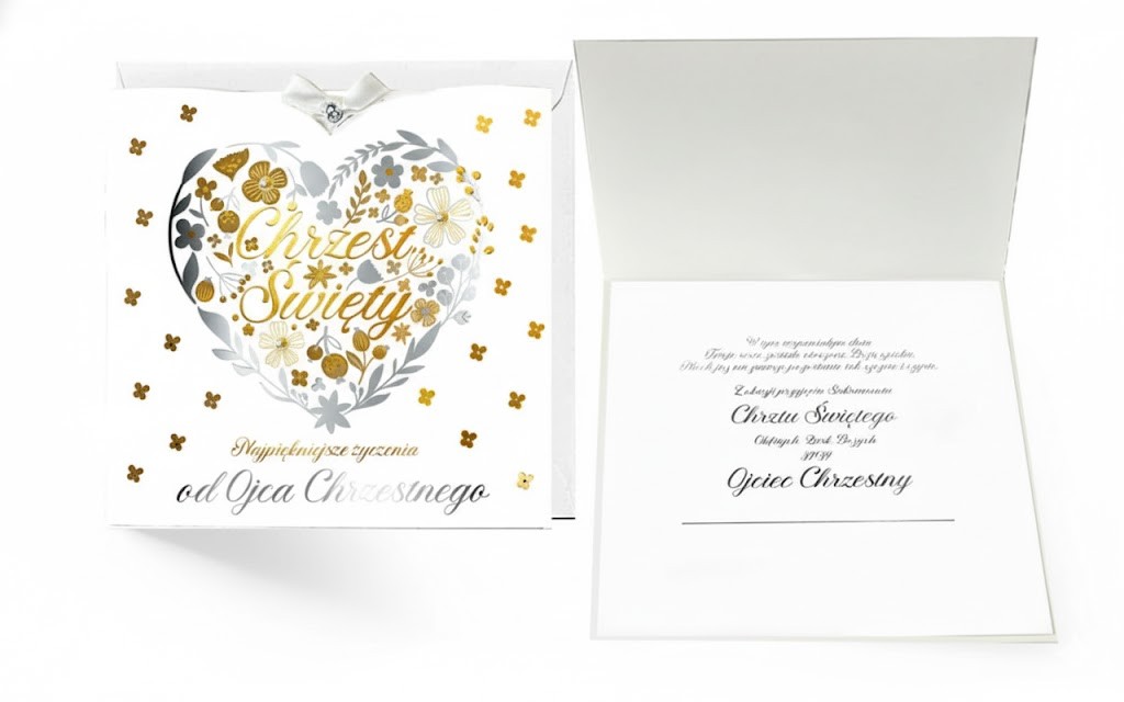 Gotowe życzenia – wewnątrz karnetu zamieszczono piękny tekst od Ojca Chrzestnego, co oszczędza czas i ułatwia przygotowanie prezentu.