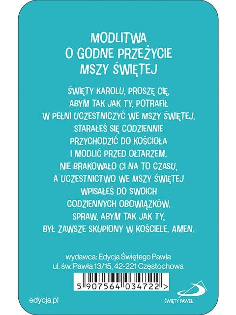 Na karcie zamieszczono tekst modlitwy za wstawiennictwem Karola Acutisa pochodzący z książki „Karol Acutis. Influencer Boga”. Na naszej stronie znajdziesz również kartę z tekstem modlitwy przed korzystaniem z internetu.