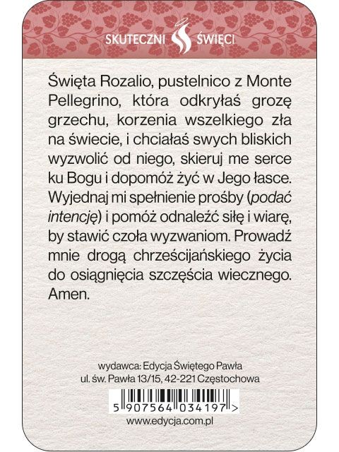 Karta stanowi komplet z modlitewnikiem z tej samej serii. Zamieszczono w nim historię życia św. Rozalii, informacje na temat kultu, cudów i beatyfikacji, modlitwy za jej wstawiennictwem (m.in. nowennę, litanię), a także miejsce na zapisanie swojej modlitwy.