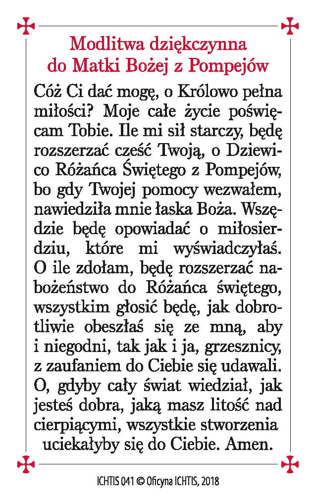 Na odwrocie modlitwa dziękczynienia do Matki Boże z Pompejów