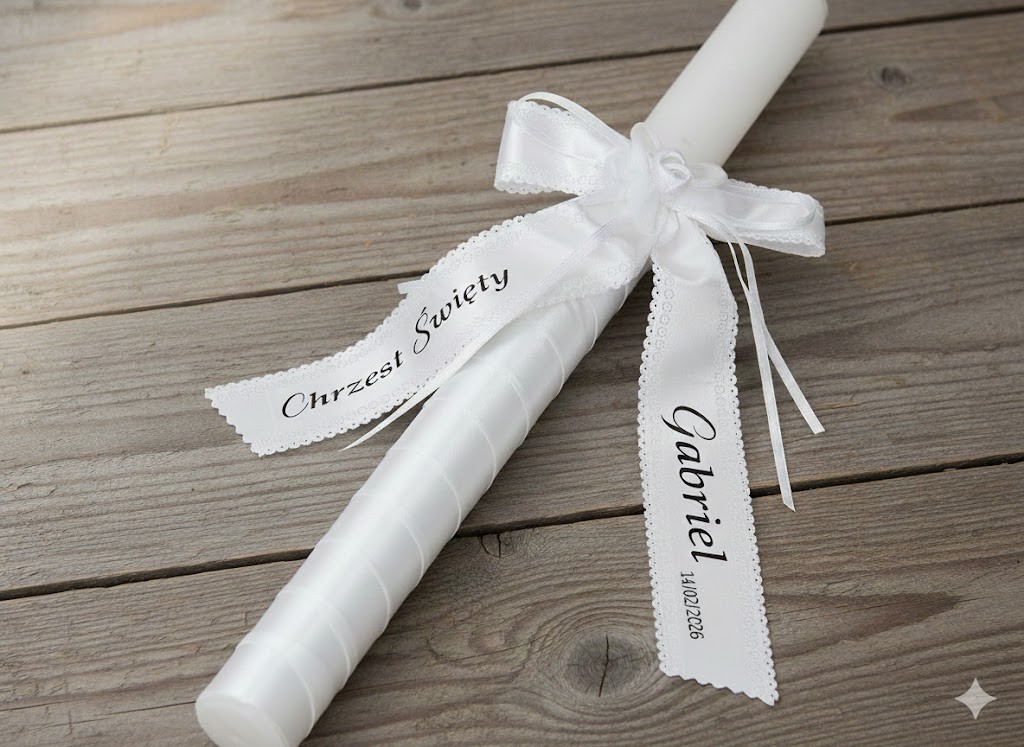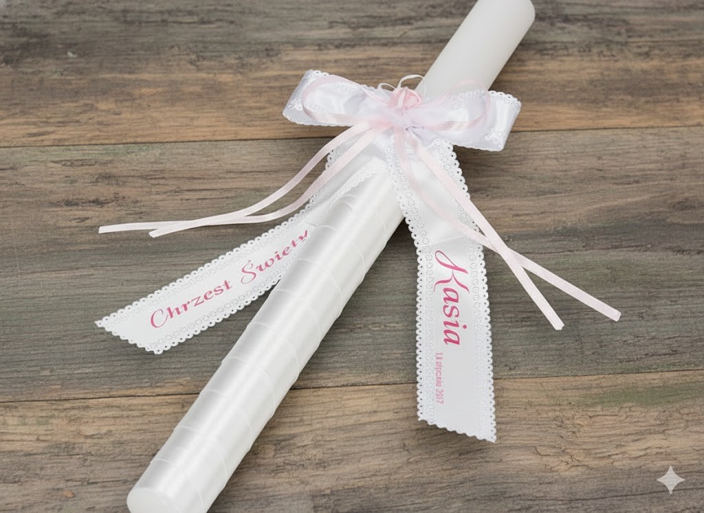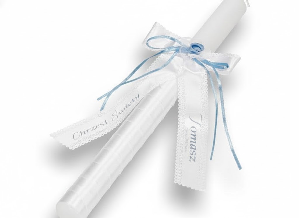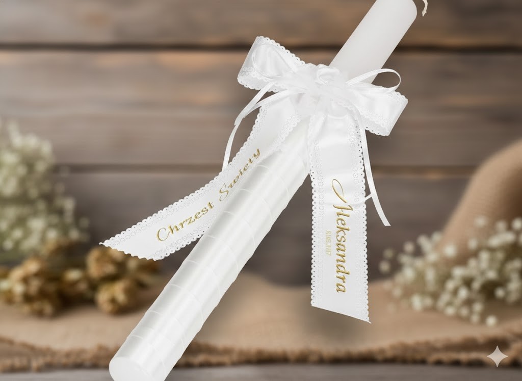 Najważniejszym elementem kokardy jest możliwość personalizacji — na ozdobie umieszczamy imię dziecka oraz datę uroczystości, tworząc pamiątkę, która pozostanie z rodziną na lata. To elegancki akcent, który podkreśla piękno sakramentu i dodaje świecy uroczystego blasku.