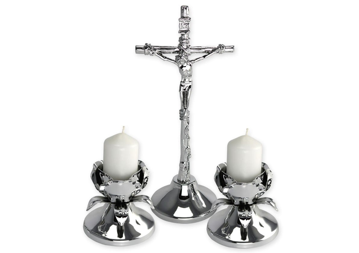 Dwa lichtarzyki – wysokość ok. 6,5 cm, dopasowane stylistycznie do krzyża,
