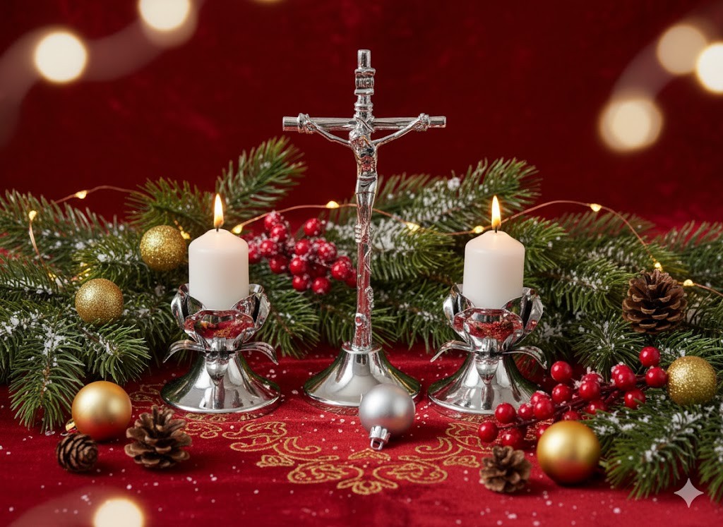 Motyw kwiatu róży symbolizuje czystość, ofiarność i piękno wiary. Srebrny kolor krzyża i lichtarzyków podkreśla duchową głębię i elegancję zestawu, czyniąc go doskonałą ozdobą stołu podczas kolędy.