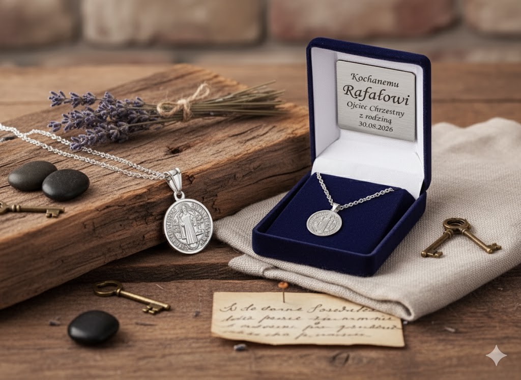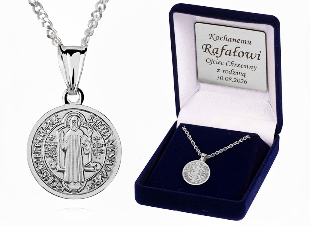 Srebrny medalik Św. Benedykta z łańcuszkiem – próba 925, dedykacja, pamiątka i ochrona