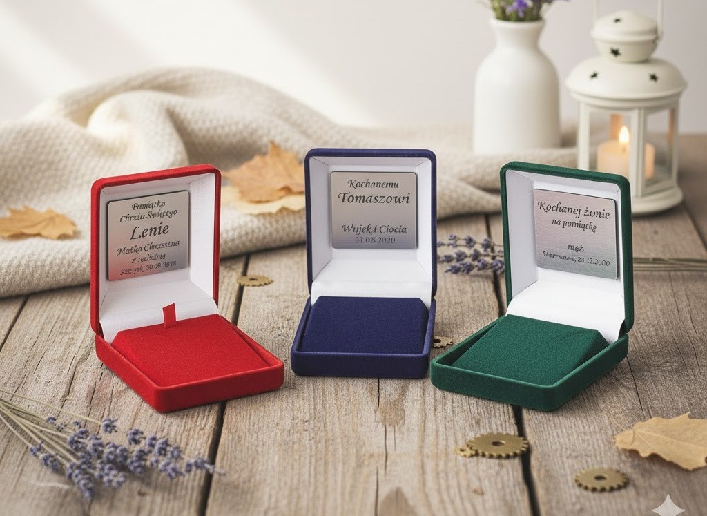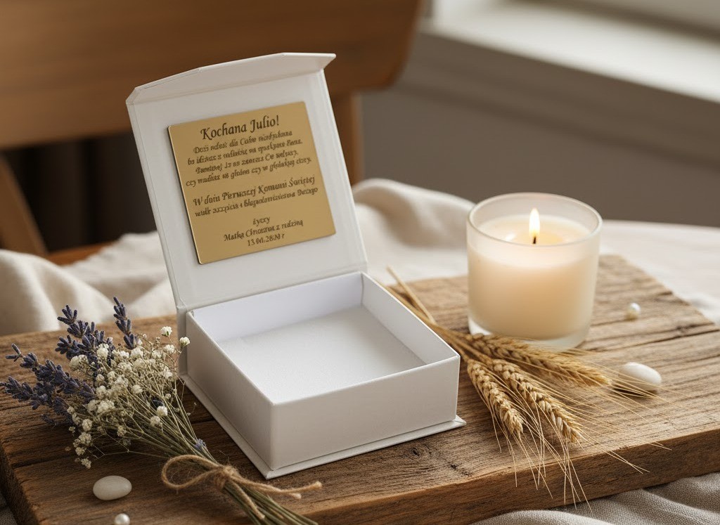Dedykację wykonujemy techniką laserową na laminowanej tabliczce wewnątrz pudełka. Można dodać imię, datę, cytat biblijny lub krótkie życzenia. Grawer objęty jest wieczystą gwarancją trwałości.