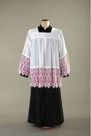 Komża kapłańska z elanobawełny, zdobiona gipiurą i podbitką kanonicką