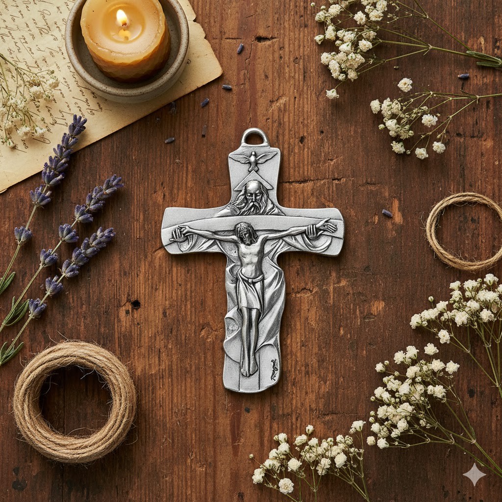 Krzyż „Trójca Święta” – Pamiątka Bierzmowania 8,5 cm (srebrny oksydowany)