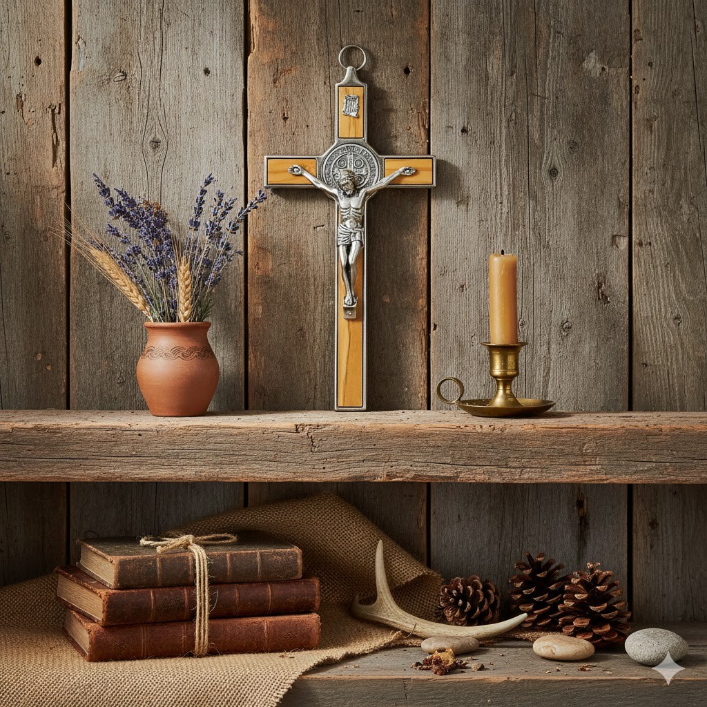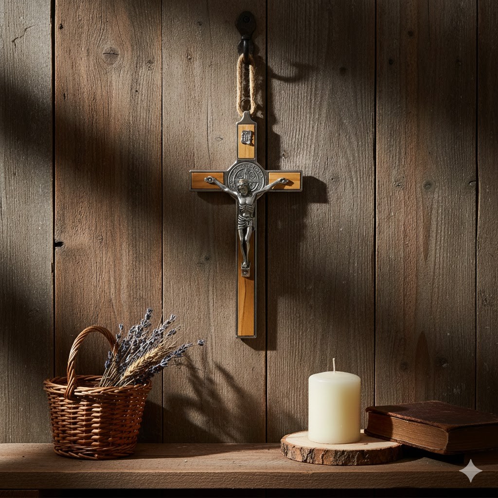 Konstrukcja krzyża łączy metalową ramę z subtelną inkrustacją z naturalnego drewna oliwnego. Oliwka, od czasów biblijnych symbol pokoju i Bożego błogosławieństwa, nadaje całości ciepło i ponadczasowy charakter. Centralne miejsce zajmuje medal św. Benedykta – znak ochrony przed złem, modlitwy o umocnienie oraz codziennego zawierzania Chrystusowi.