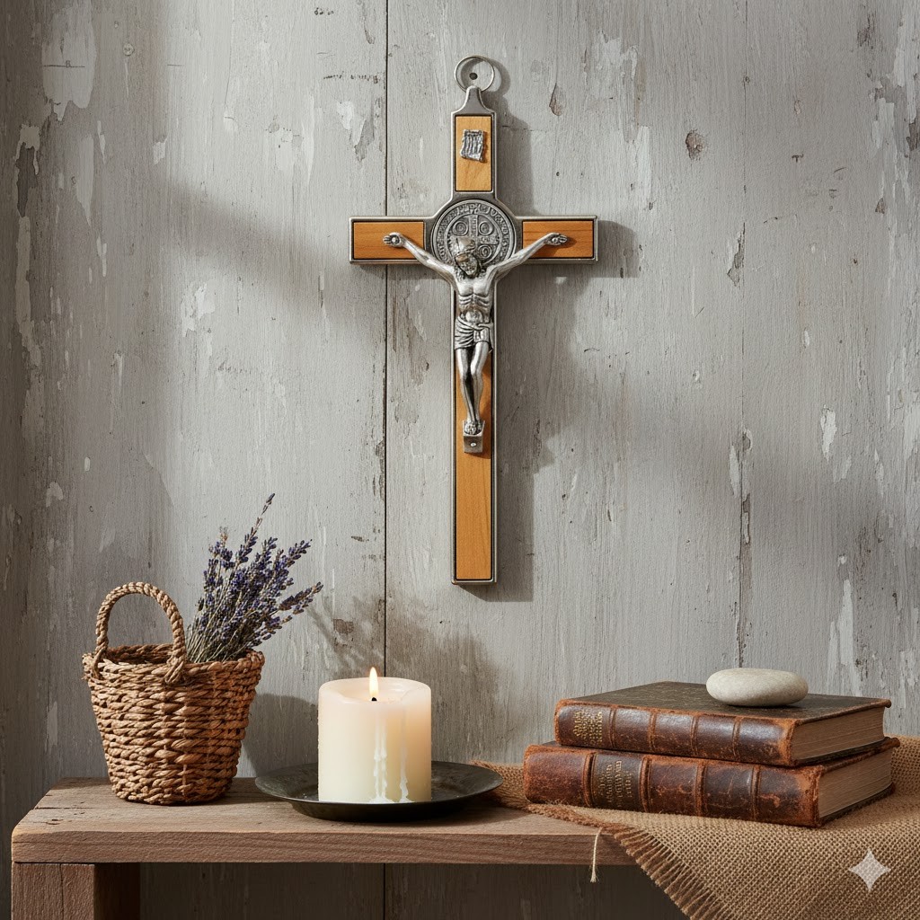 Krzyż św. Benedykta jest jednym z najstarszych symboli chrześcijańskiej ochrony. Medal umieszczony na krzyżu odnosi się do modlitwy o obronę przed złem, umocnienie w wierze oraz prowadzenie przez Chrystusa.