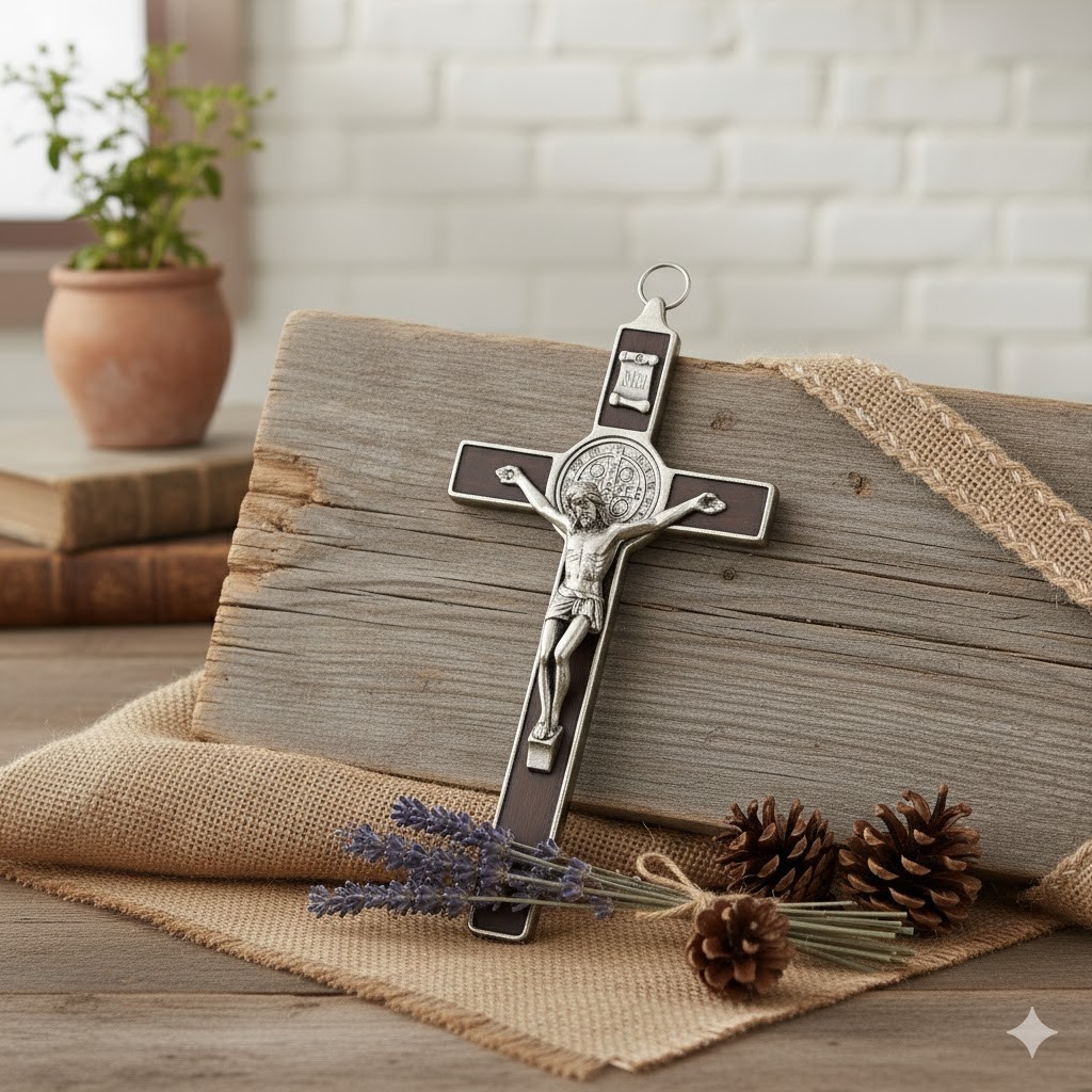 Krzyż benedyktyński to jeden z najbardziej rozpoznawalnych symboli chrześcijaństwa, niosący przesłanie zwycięstwa dobra nad złem. Zawiera medal św. Benedykta, który od wieków uznawany jest za znak ochrony przed pokusami i niebezpieczeństwami duchowymi. Jego obecność w domu przynosi spokój, wiarę i wewnętrzną równowagę.