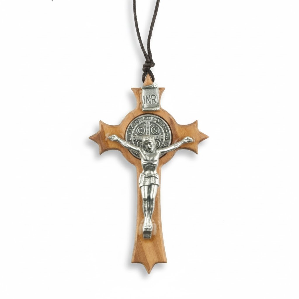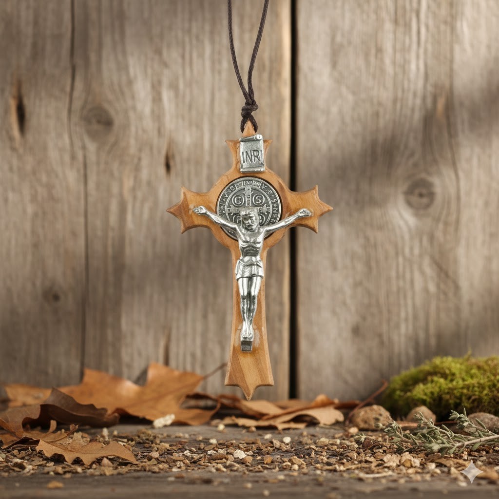 Ten niewielki, ale wyjątkowo symboliczny krzyżyk Benedyktyński wykonany jest z naturalnego, jasnego drewna bukowego i ozdobiony metalowym wizerunkiem Chrystusa oraz medalem św. Benedykta – jednym z najsłynniejszych znaków ochrony duchowej w tradycji Kościoła.