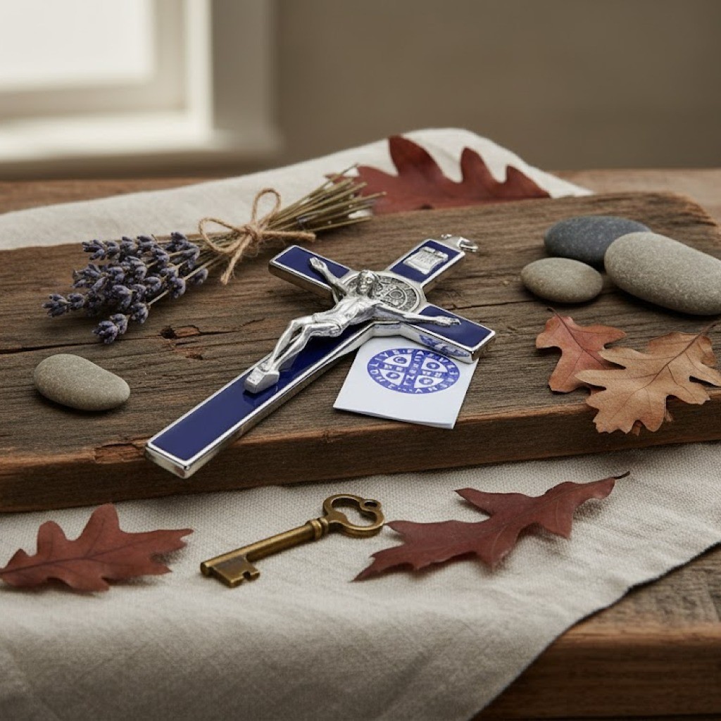 Krzyż benedyktyński to ważny symbol chrześcijaństwa, niosący przesłanie zwycięstwa nad złem, nadziei i Bożej ochrony. Niebieskie wykończenie dodaje mu wymiaru duchowego spokoju i odniesienia do nieba. Zawieszony w przestrzeni domowej staje się codziennym przypomnieniem o obecności Bożej oraz manifestacją osobistej wiary.