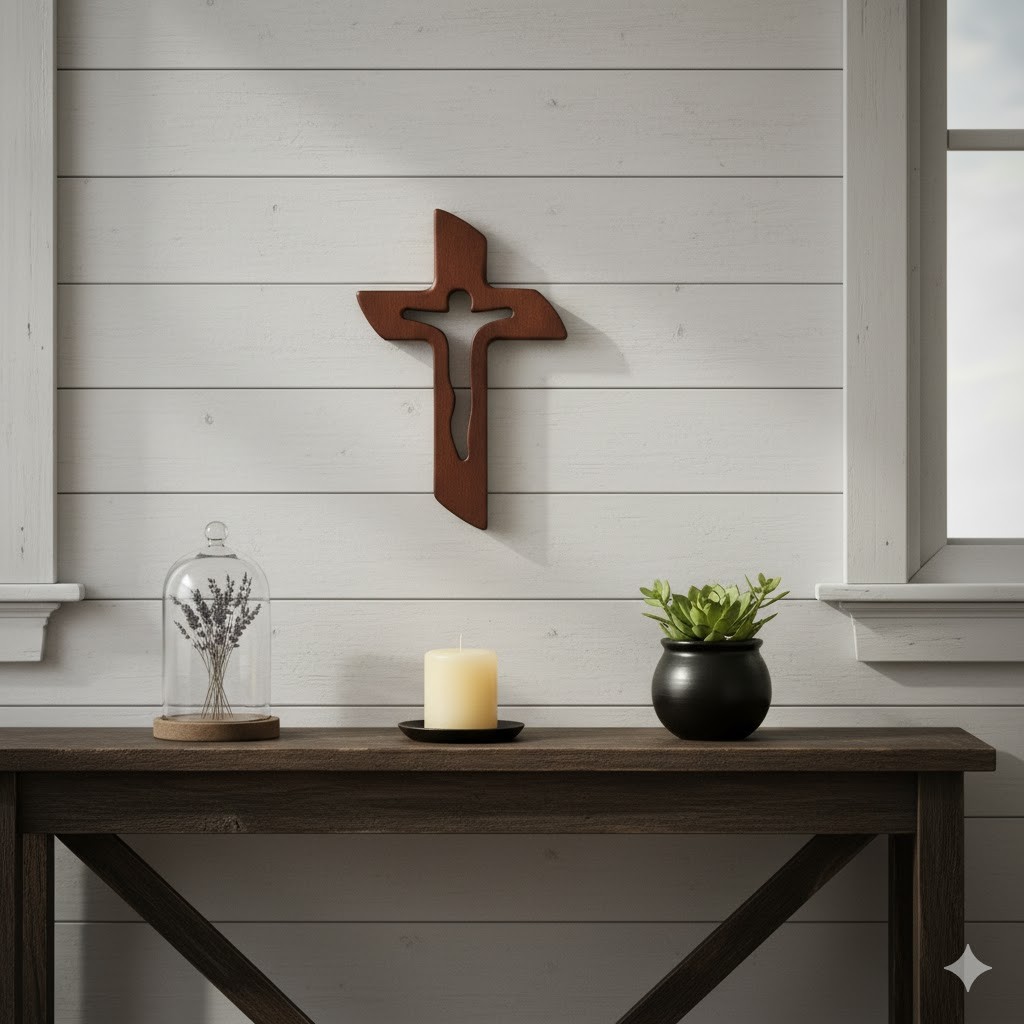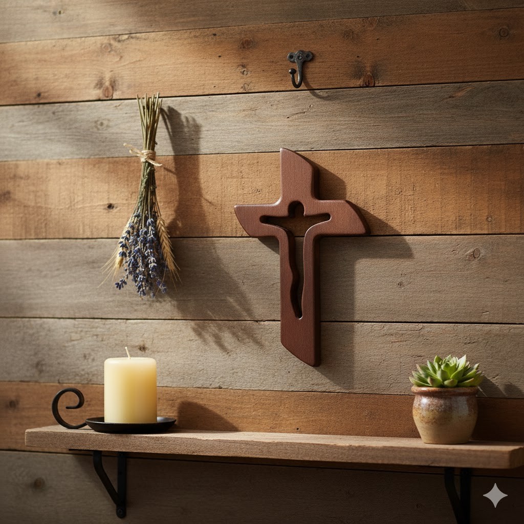 Ten krzyż łączy w sobie prostotę natury i duchowe piękno symbolu wiary. Wykonany z jednego kawałka drewna, z wyciętą sylwetką Chrystusa w centralnej części, zachwyca harmonią formy i minimalizmem. Subtelny kształt postaci Zbawiciela sprawia, że krzyż nabiera głębi – stanowi piękne zaproszenie do modlitwy i refleksji.