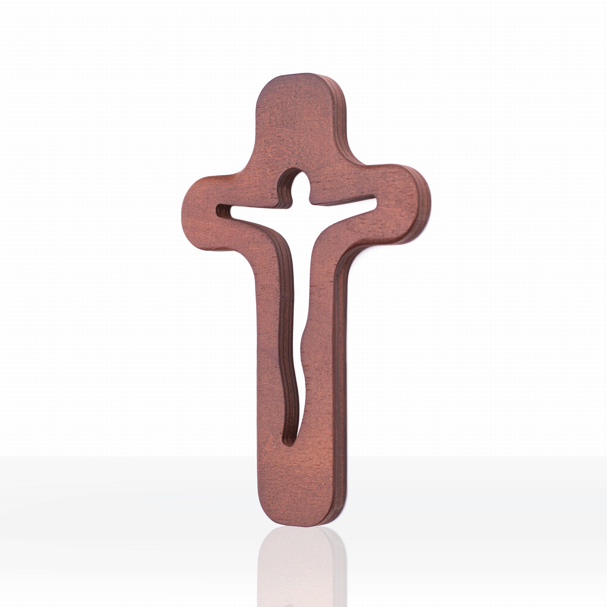 Krzyż wykonany z jednego fragmentu drewna. Przyjemny w dotyku dzięki gładkim zaokrąglonym krawędziom. Powierzchnia zabezpieczona bezbarwnym lakierem. Dodatkowo w tylnej części krzyża znajduje się otwór umożliwiający zawieszanie. Wyjątkowy dzięki kształtowi Jezusa wyciętego w środku krzyża.