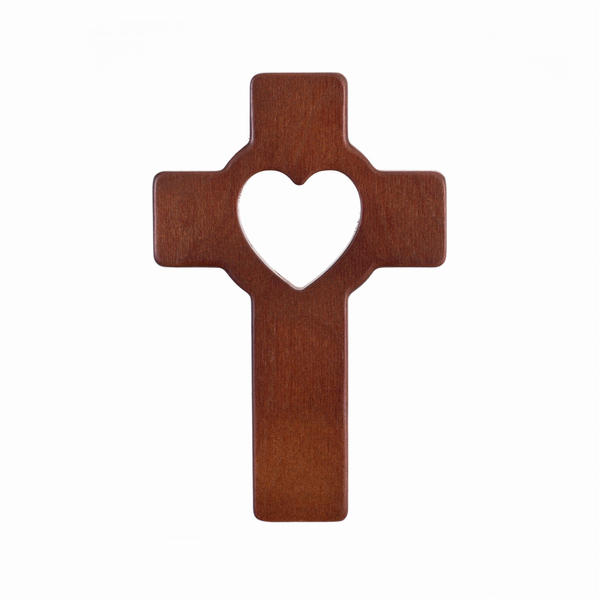 Krzyż wykonany z jednego fragmentu drewna. Przyjemny w dotyku dzięki gładkim zaokrąglonym krawędziom. Powierzchnia zabezpieczona bezbarwnym lakierem. Dodatkowo w tylnej części krzyża znajduje się otwór umożliwiający zawieszanie. Wyjątkowy dzięki kształtowi serca wyciętego w środku krzyża.