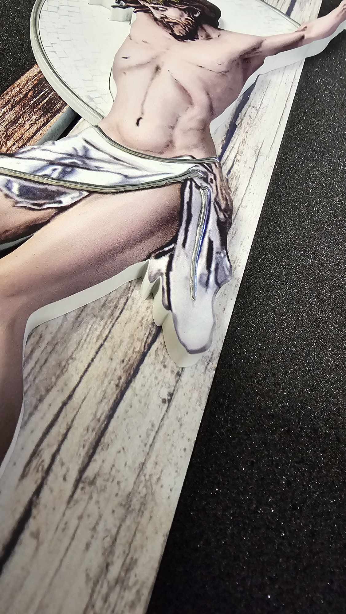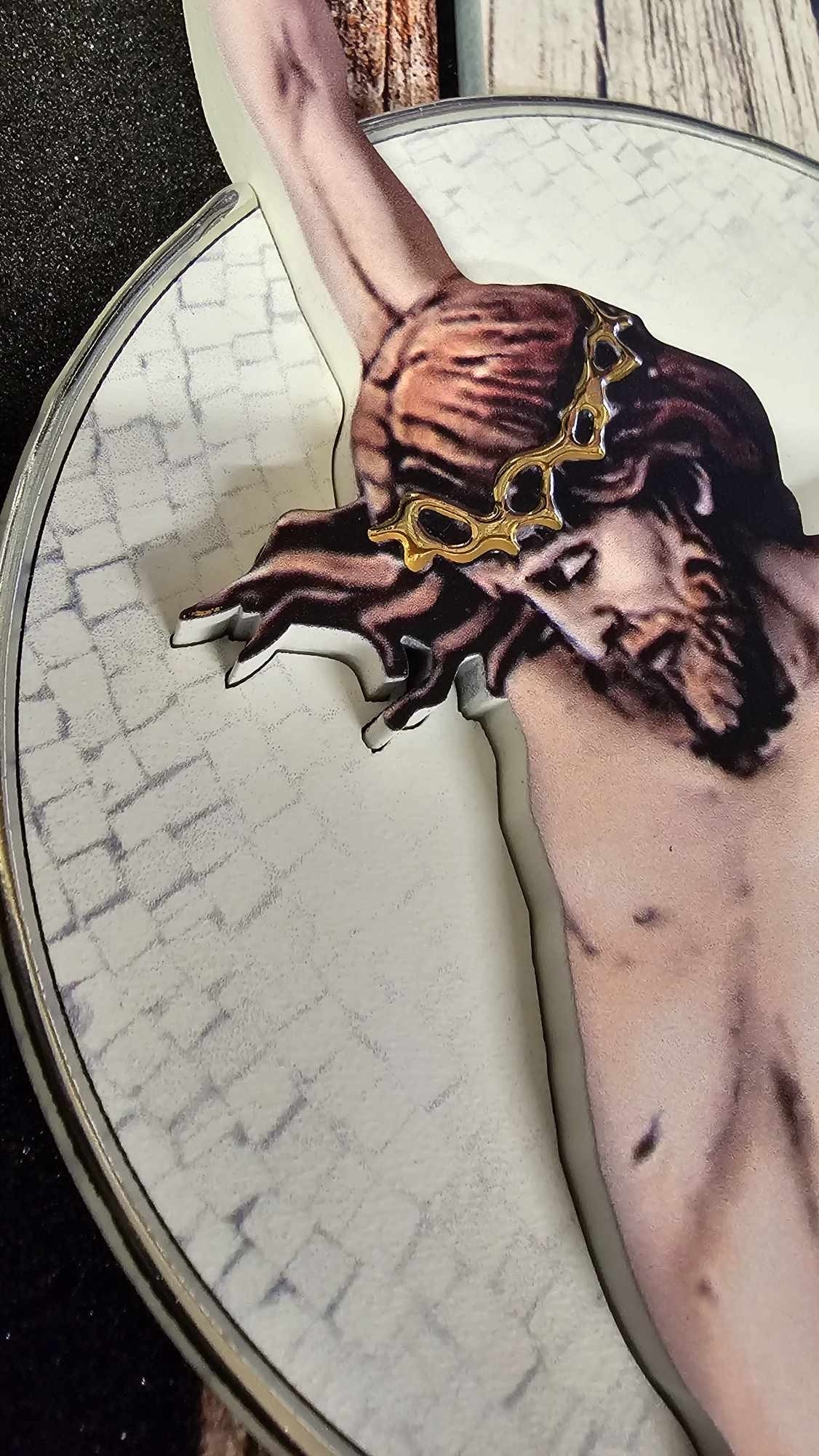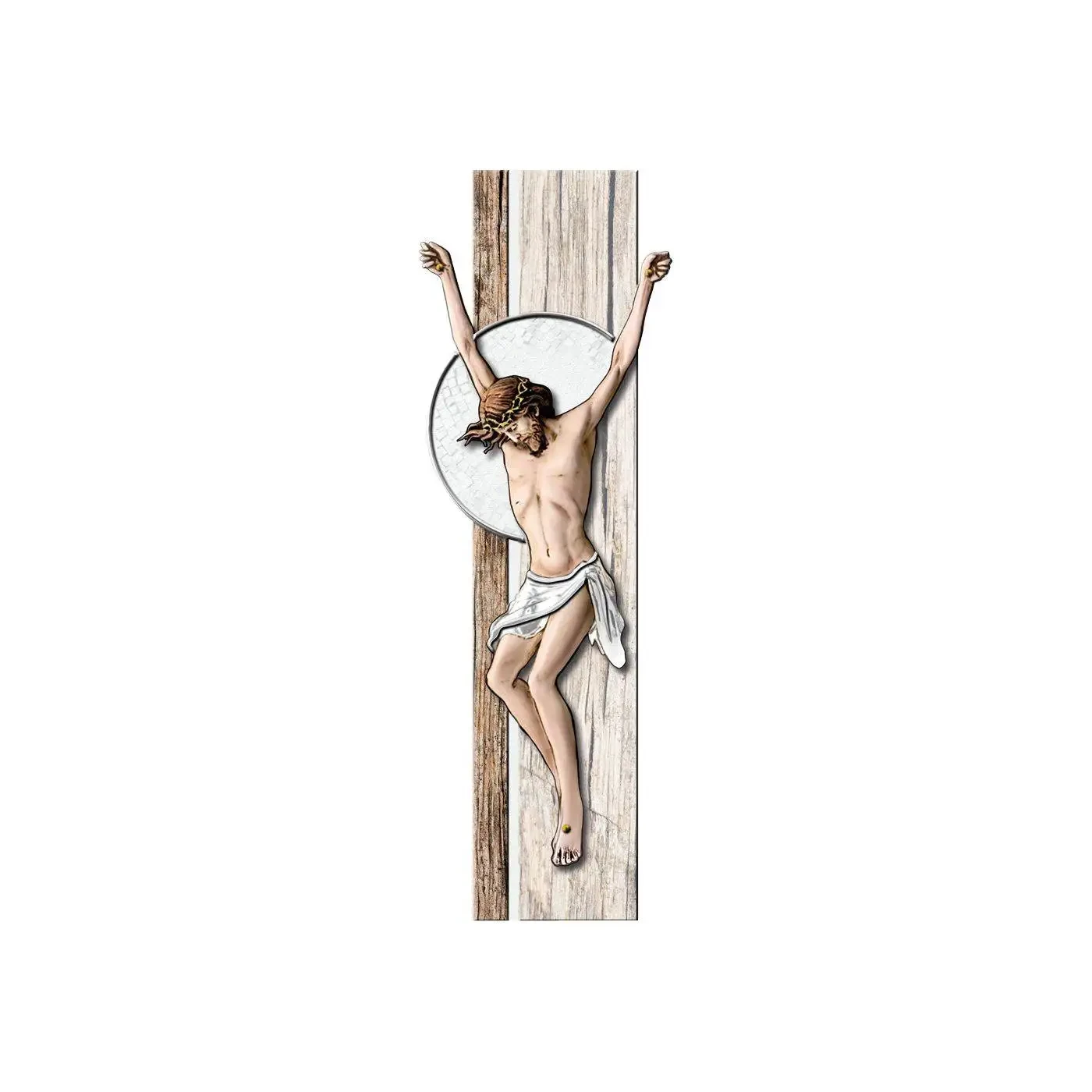 Krzyż drewniany, podwójne drewno, Jezus malowany na drewnie ręcznie zdobiony złotą i srebrną farbą.