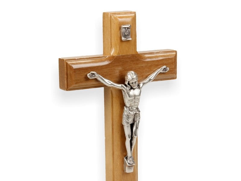 Krzyż wykonany z drzewa oliwnego na podstawce