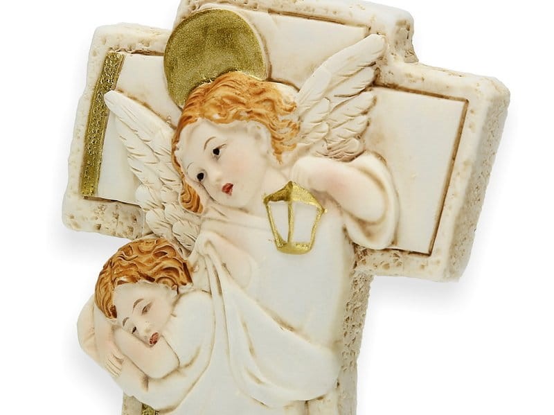 Krzyż stojący z żywicy malowany, z wizerunkiem Anioła Stróża