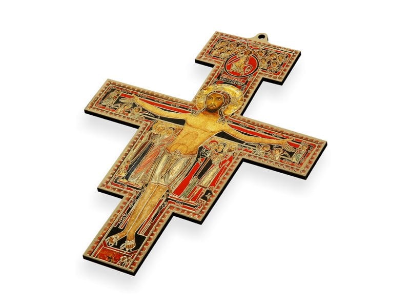Krzyż wykonany na drewnianej deseczce przedstawiający Jezusa Ukrzyżowanego, na krzyżu San Damiano można odnaleźć 33 postacie.Krzyż posiada uchwyt do zawieszenia na ścianie.