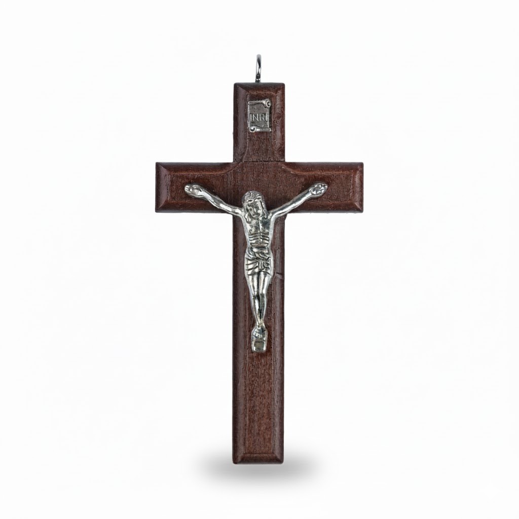 Prosty, a jednocześnie niezwykle wymowny krzyżyk, który stanowi czytelny znak wiary i Bożej obecności w codziennym życiu. Wykonany z ciemnego, lakierowanego drewna, zachwyca naturalną strukturą i elegancją. Centralnym punktem jest metalowy korpus Pana Jezusa, precyzyjnie odwzorowany, dzięki czemu krzyżyk zyskuje szlachetny charakter.