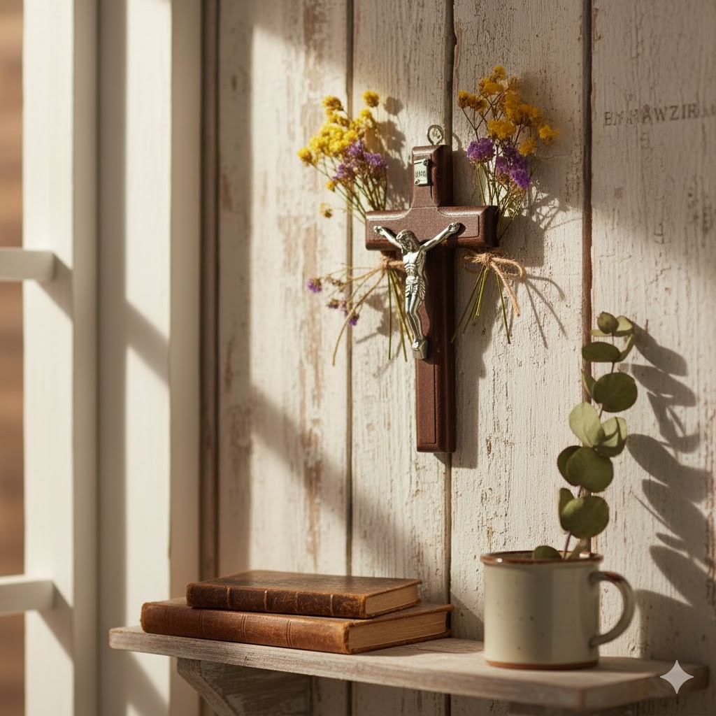 Krzyż przypomina o miłości Chrystusa, która przemienia życie wierzących. Obecność krzyża w domu jest wyrazem zawierzenia Bogu, zaproszeniem do modlitwy i znakiem przynależności do wspólnoty Kościoła.