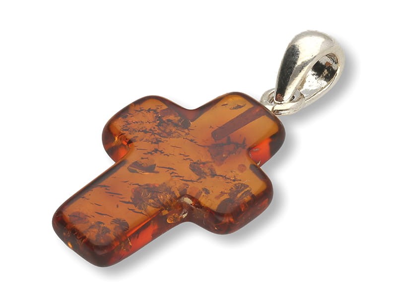 Krzyżyk wykonany z bursztynu z srebrna krawatką (zawieszką)