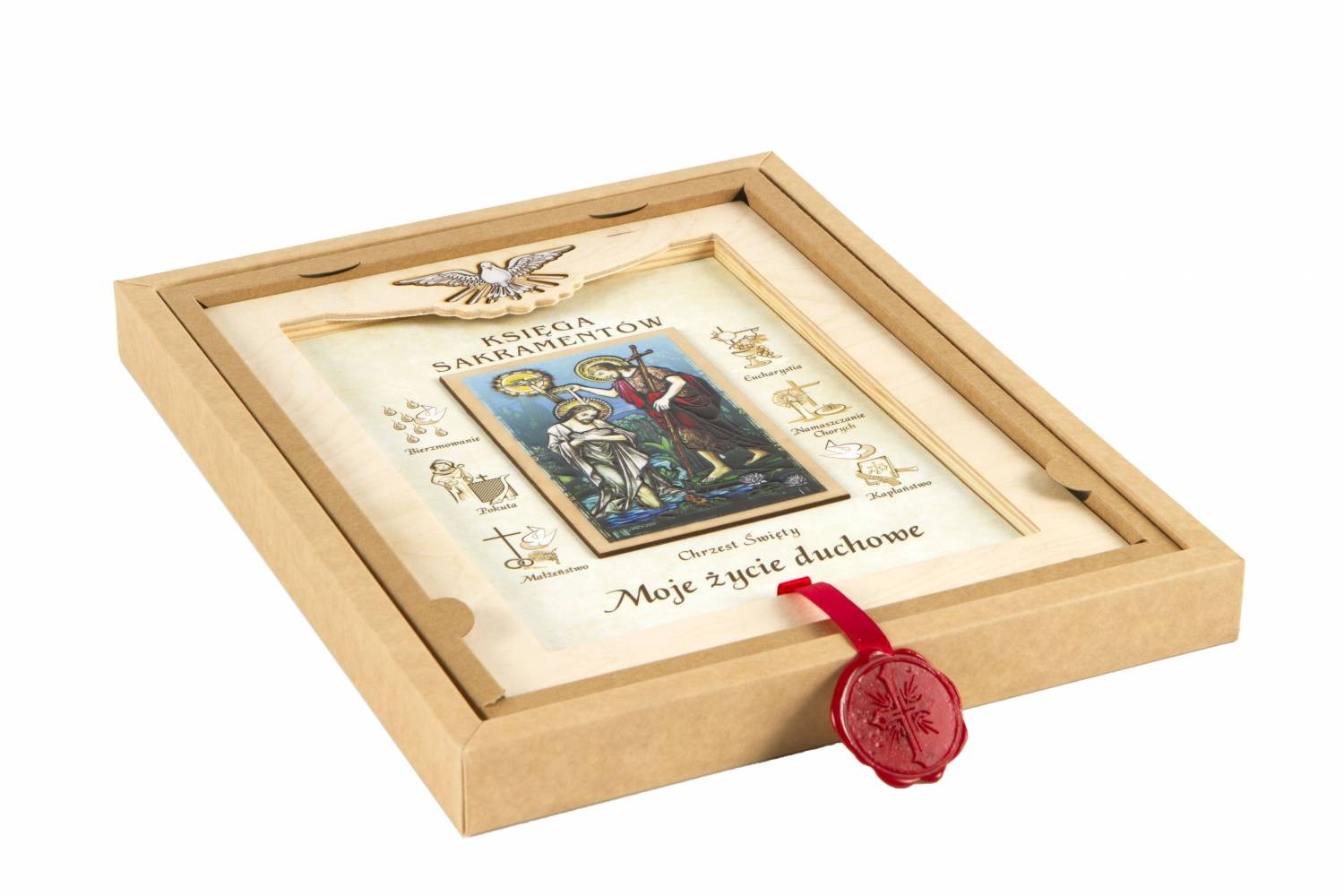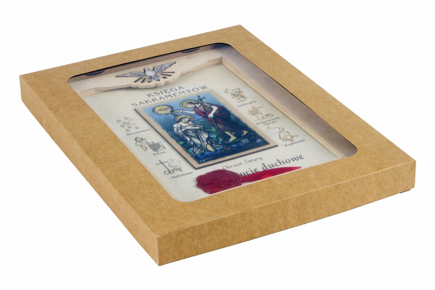 Szczegóły techniczne: - wymiary Księgi Sakramentów: szer. 15,5 x wys. 22 cm, 48 stron - wymiary ramki (sklejka + drewno): szer. 19,5 x wys. 26 x gł. 2 cm - wymiary opakowania (karton z przezroczystym okienkiem z folii): szer. 24 x wys. 31 x gł. 3 cm - waga kompletu (Księga + ramka + opakowanie): 0,5 kg