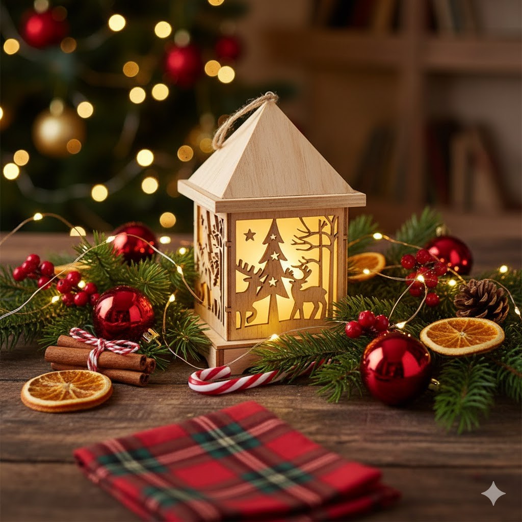 Ekologiczny Design: Lampion wykonany jest z jasnego, naturalnego drewna, co nadaje mu ciepły i rustykalny charakter, idealnie pasujący do klimatu świąt.