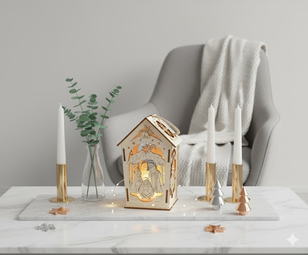 Naturalny, stylowy lampion w świątecznym duchu — świetny wybór na adwentowe wieczory, Roraty lub jako subtelna dekoracja do domu. Wykonany z drewna i pomalowany na delikatny biały kolor, łączy ekologiczną estetykę, ciepło tradycji i styl nowoczesnego wnętrza.