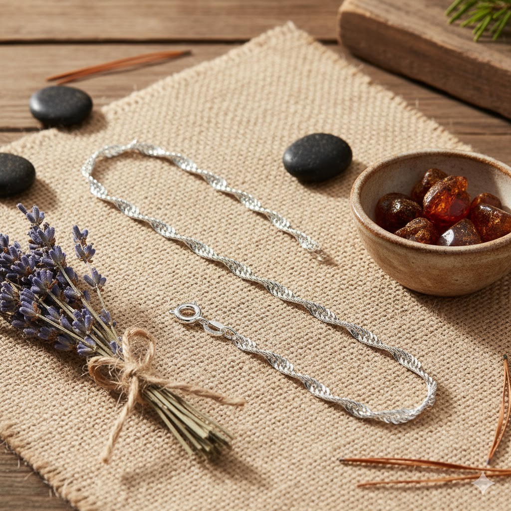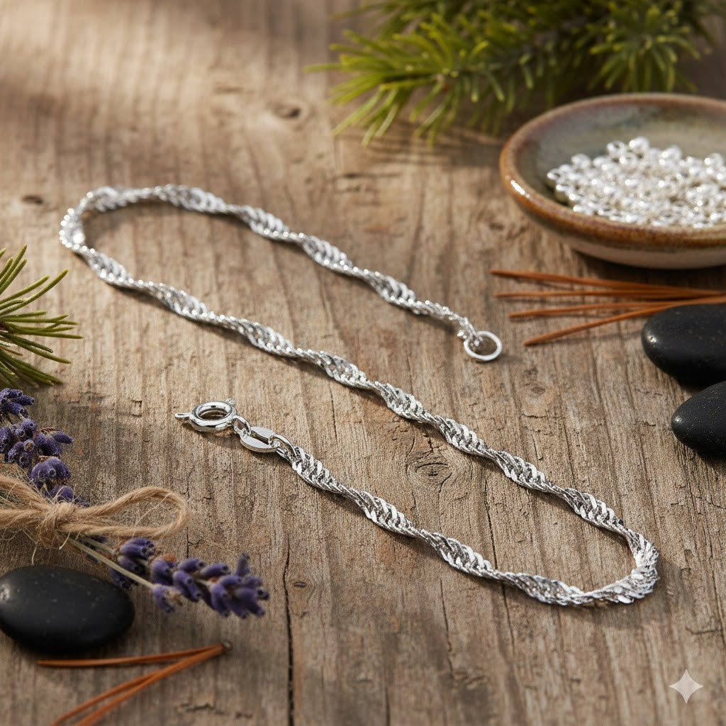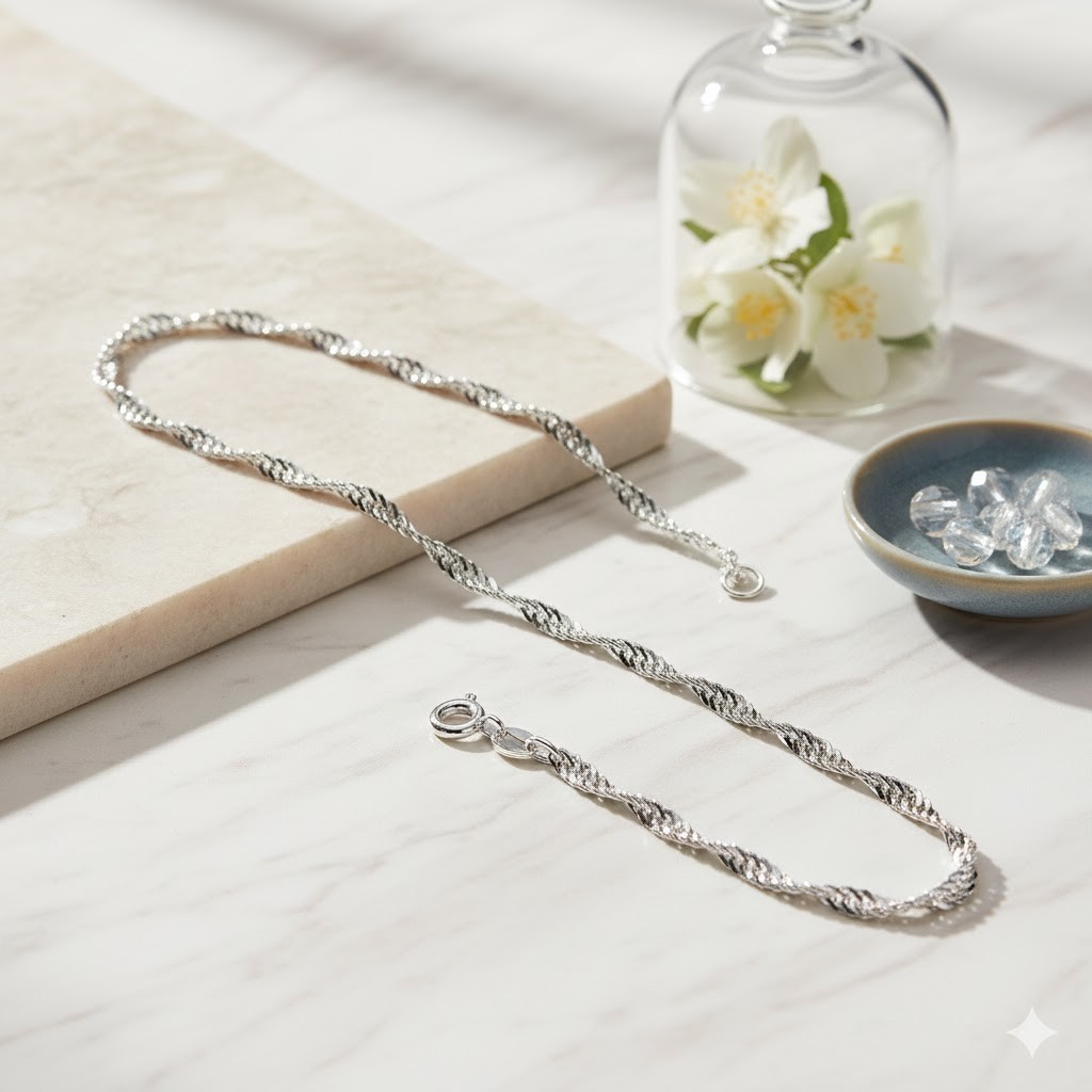 Elegancki łańcuszek srebrny próby 925 typu Singapur to połączenie klasycznej formy, włoskiego kunsztu jubilerskiego i ochronnej warstwy rodu, która nadaje biżuterii wyjątkowy połysk i trwałość.