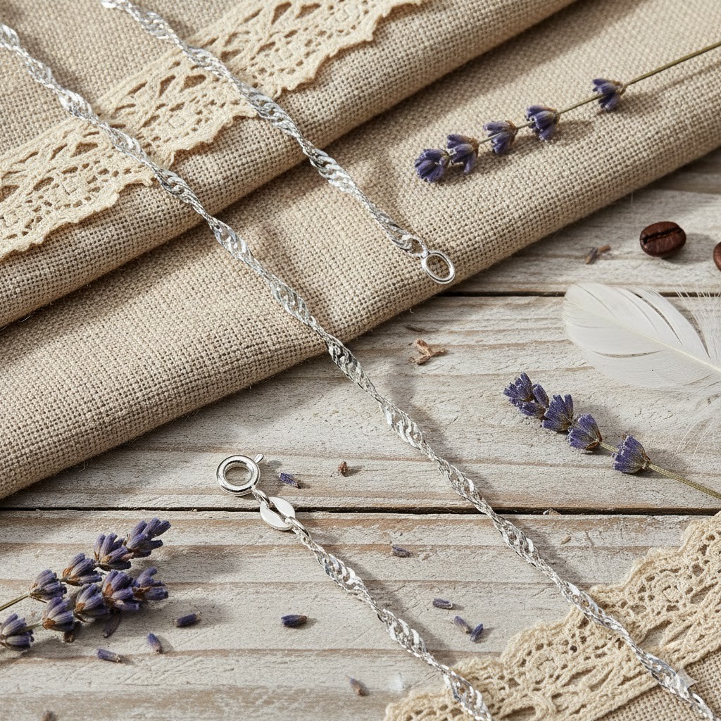 Każdy egzemplarz wykonano z wysokiej jakości srebra próby 925, pochodzącego z włoskiej manufaktury. Charakterystyczny splot Singapur sprawia, że łańcuszek pięknie odbija światło, subtelnie błyszcząc przy ruchu, a zarazem zachowując wysoką wytrzymałość i odporność na odkształcenia.