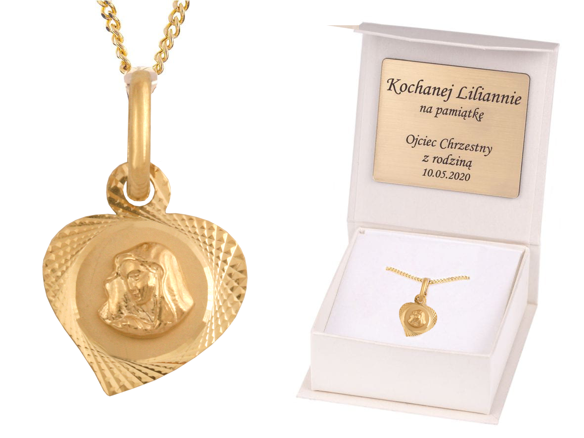 Współczesny medalik w kształcie serduszka z wizerunkiem Matki Boskiej na łańcuszku (pr.585) w pudełeczku z grawerem