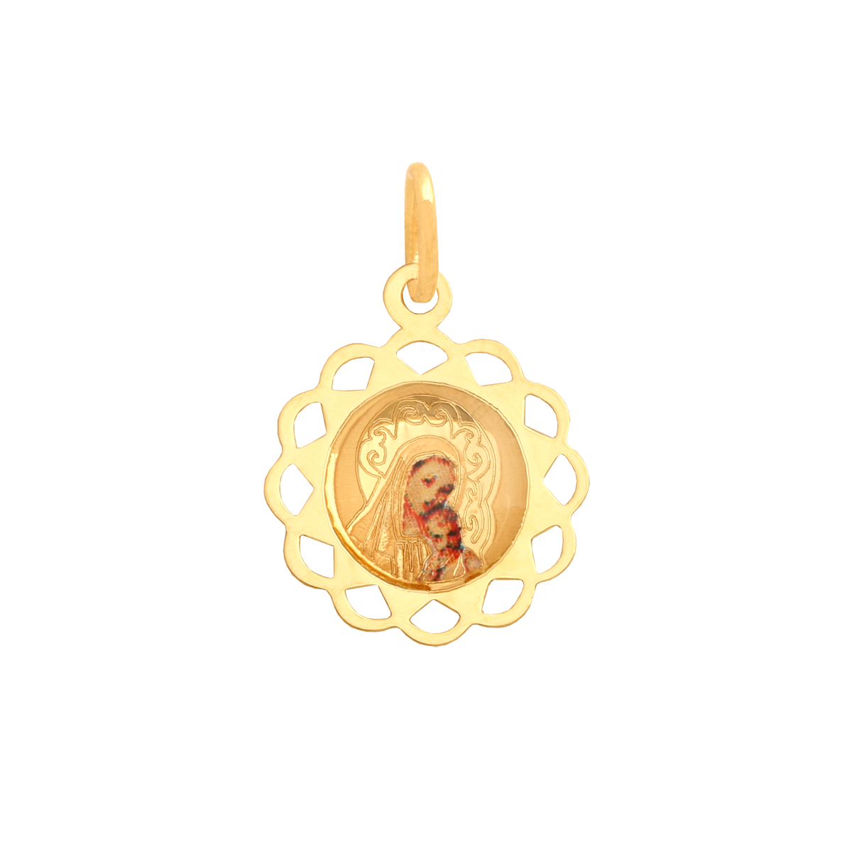 - wizerunek: Nowoczesny medalik w kształcie serduszka z wizerunkiem Matki Boskiej z Dzieciątkiem