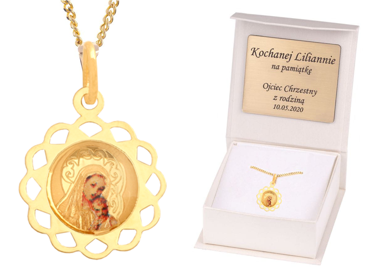 Matka Boska z dzieciątkiem ZŁOTY ZESTAW medalik łańcuszek pr. 585 DEDYKACJA - Pamiątka Prezent