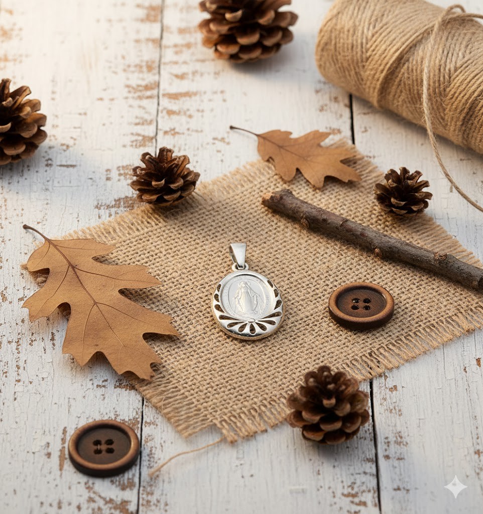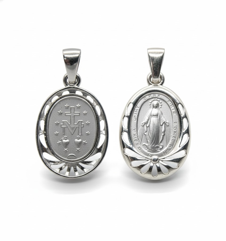 Ażurowa ramka, w której osadzono medalik, nadaje mu szlachetnego charakteru, czyniąc z niego elegancki element biżuterii religijnej odpowiedni na co dzień, jak i na szczególne okazje sakramentalne.