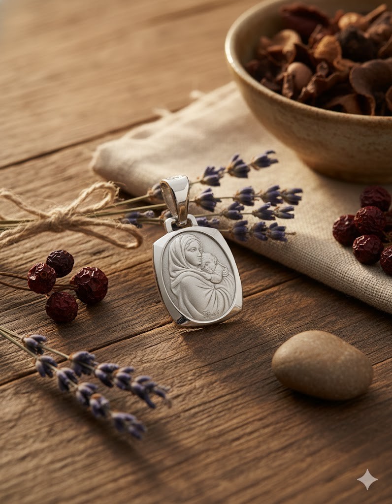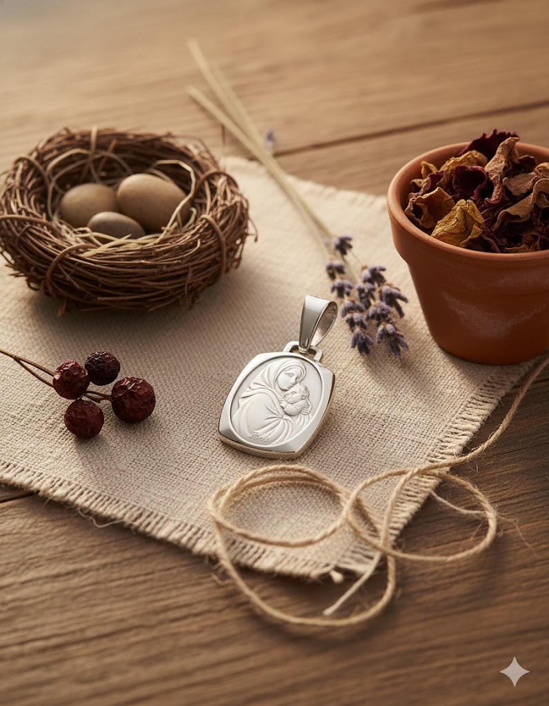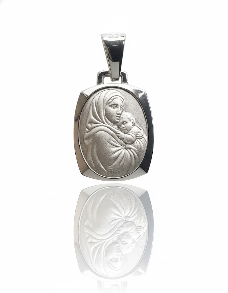Srebrny medalik z wizerunkiem Matki Bożej Cygańskiej to subtelny, a jednocześnie bardzo wymowny znak wiary i opieki. Wykonany z wysokiej jakości srebra próby 925, przedstawia Maryję tulącą Dzieciątko – w bliskości, czułości i matczynej trosce. To wizerunek, który ukazuje Maryję nie jako odległą Królową, lecz jako Matkę idącą z człowiekiem przez codzienność: cichą, wierną i pełną współczucia.