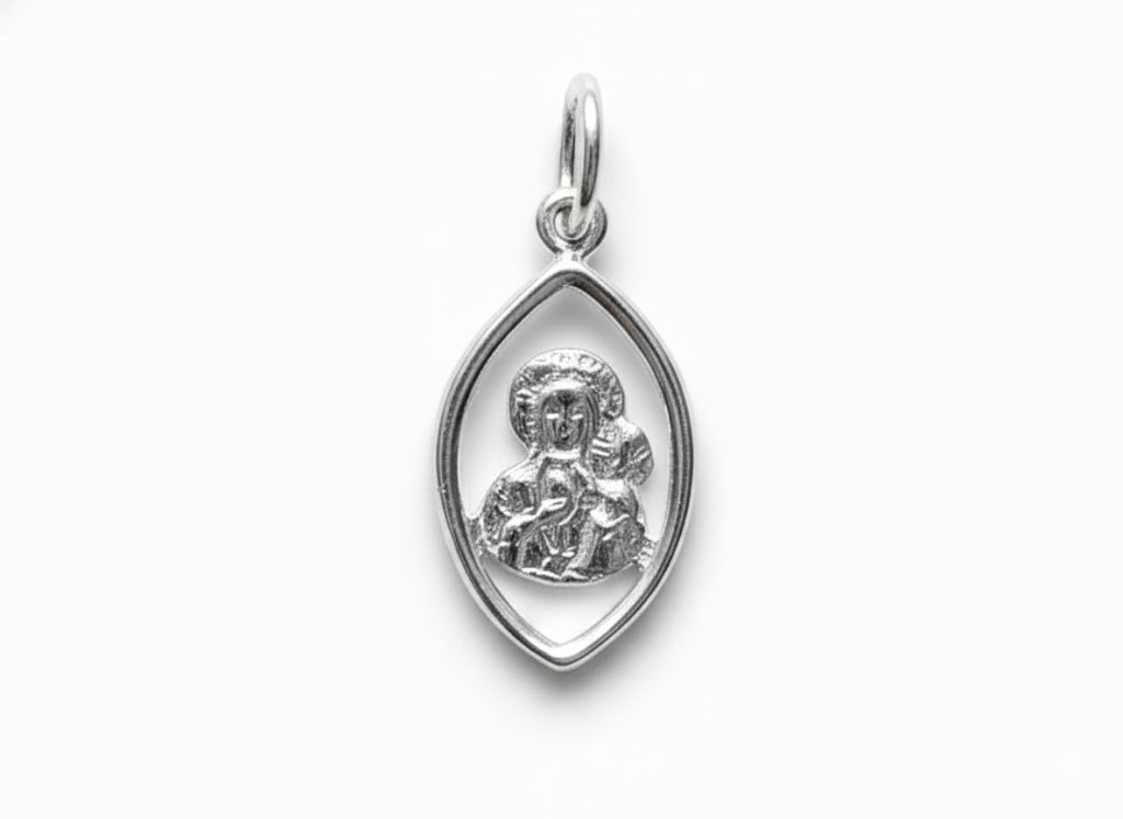 Ten delikatny, a jednocześnie pełen duchowej symboliki medalik przedstawia Matkę Bożą z Dzieciątkiem Jezus – jeden z najbardziej rozpoznawalnych i ukochanych wizerunków Maryi w tradycji chrześcijańskiej. Subtelna, eliptyczna rama otacza wizerunek, nadając całości lekkości i elegancji. To biżuteria, która nie tylko zdobi, ale przede wszystkim niesie przesłanie opieki, miłości i zawierzenia Bogu.