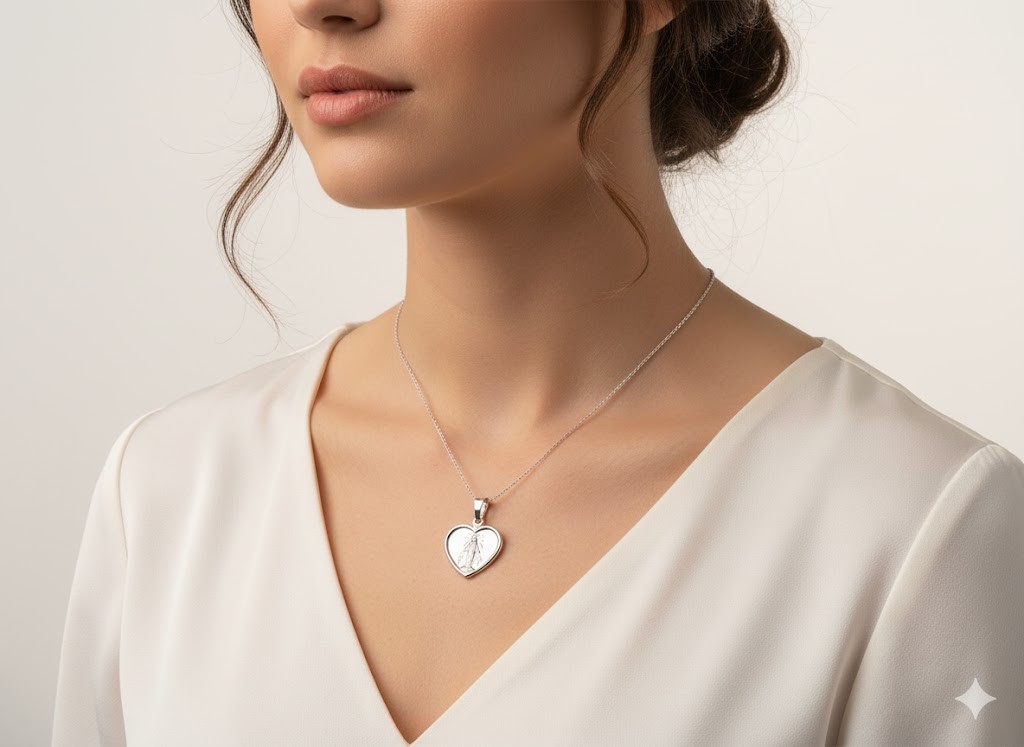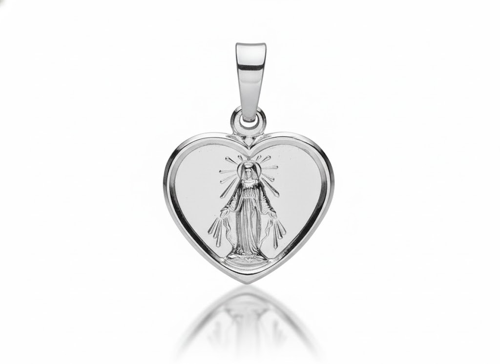 Ten srebrny medalik z wizerunkiem Matki Bożej Niepokalanej oraz motywem serca jest delikatną, a zarazem głęboko symboliczną pamiątką duchową. Wykonany z wysokiej jakości srebra (próba 925), waży około 1,9 g – co czyni go subtelnym dodatkiem, który można nosić codziennie lub na wyjątkowe okazje.