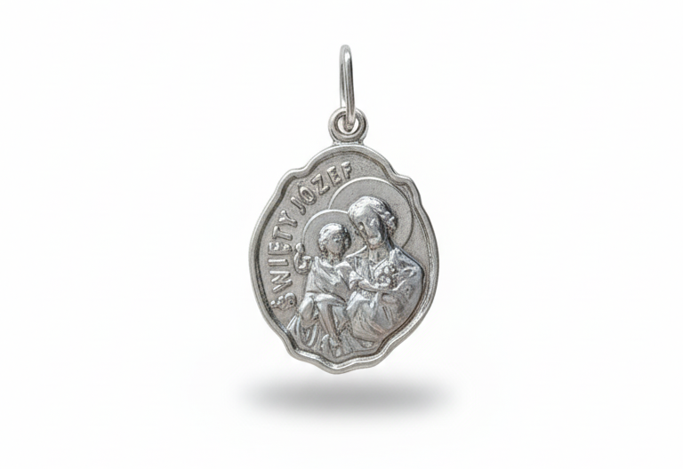 Ten srebrny medalik przedstawiający Świętego Józefa z Dzieciątkiem Jezus to wyjątkowy znak wiary, opieki i zaufania wobec opiekuna Świętej Rodziny. Wykonany ze srebra próby 925, stanowi trwały i piękny element biżuterii religijnej, który może towarzyszyć codziennej modlitwie i duchowemu życiu. Jego precyzyjne tłoczenie i staranne polerowanie wydobywają szczegóły wizerunku Świętego Józefa – patrona rodzin, małżeństw, pracujących oraz osób poszukujących pomocy w trudnych sprawach.