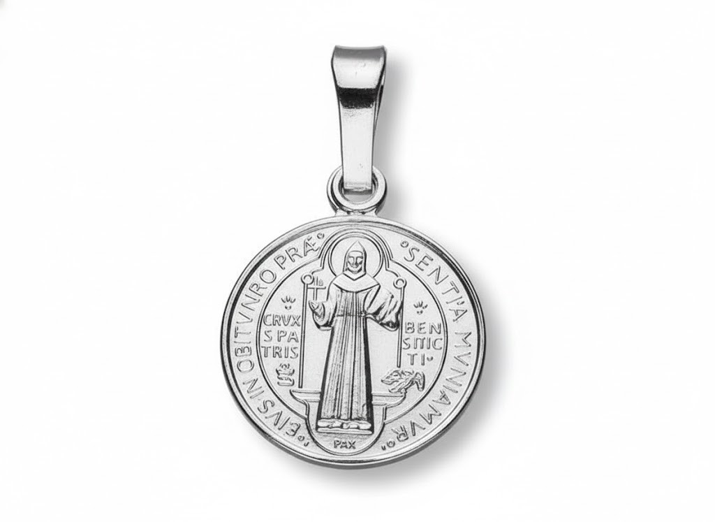 Srebrny medalion benedyktyński to klasyczny i ponadczasowy znak chrześcijańskiej wiary, noszony jako symbol zawierzenia Bogu i duchowej ochrony. Wykonany ze srebra próby 925, z dbałością o szczegół, przedstawia pełne znaczenia wizerunki: św. Benedykta na awersie i Krzyż św. Benedykta z literami modlitwy egzorcyzmującej na rewersie.