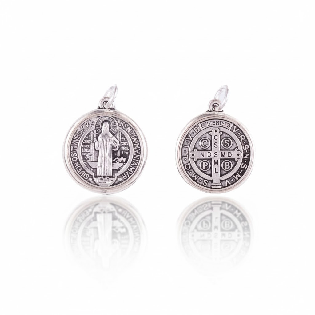 Piękny medalion z wizerunkiem Święty Benedykt z Nursji, o średnicy 2,2 cm — elegancka pamiątka sakramentu, znak duchowej ochrony i osobistej relacji z Bogiem.