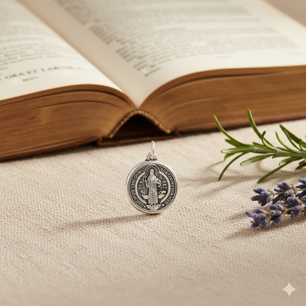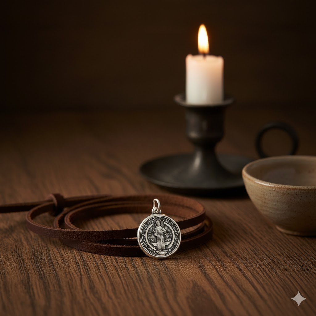 Litery i inskrypcje typowe dla medalika (jak „Crux sancti Patris Benedicti”) przypominają o Krzyżu i mocy Chrystusa w życiu wierzącego.