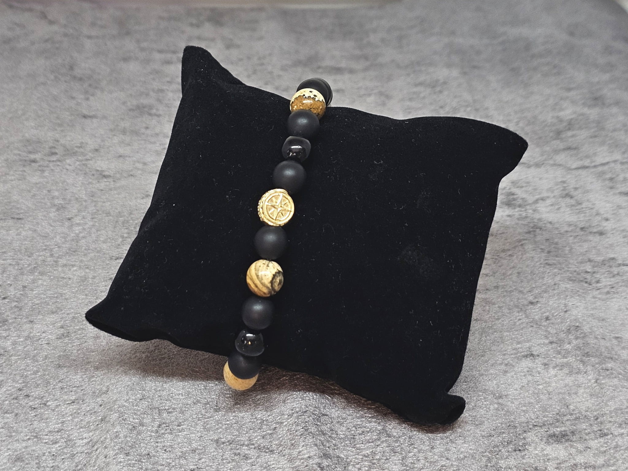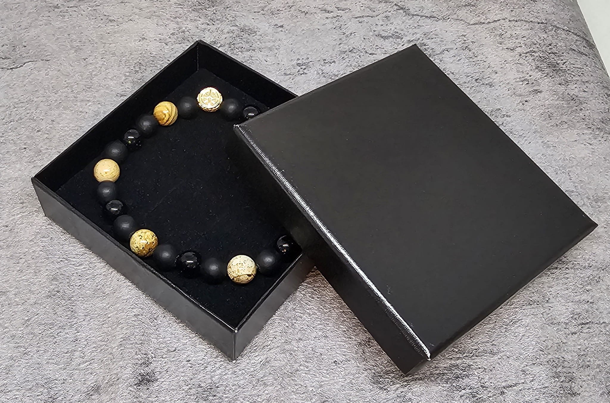 - Wygląd: Czarne, matowe koraliki pochłaniające światło, nadające bransoletce surowy i nowoczesny wygląd.