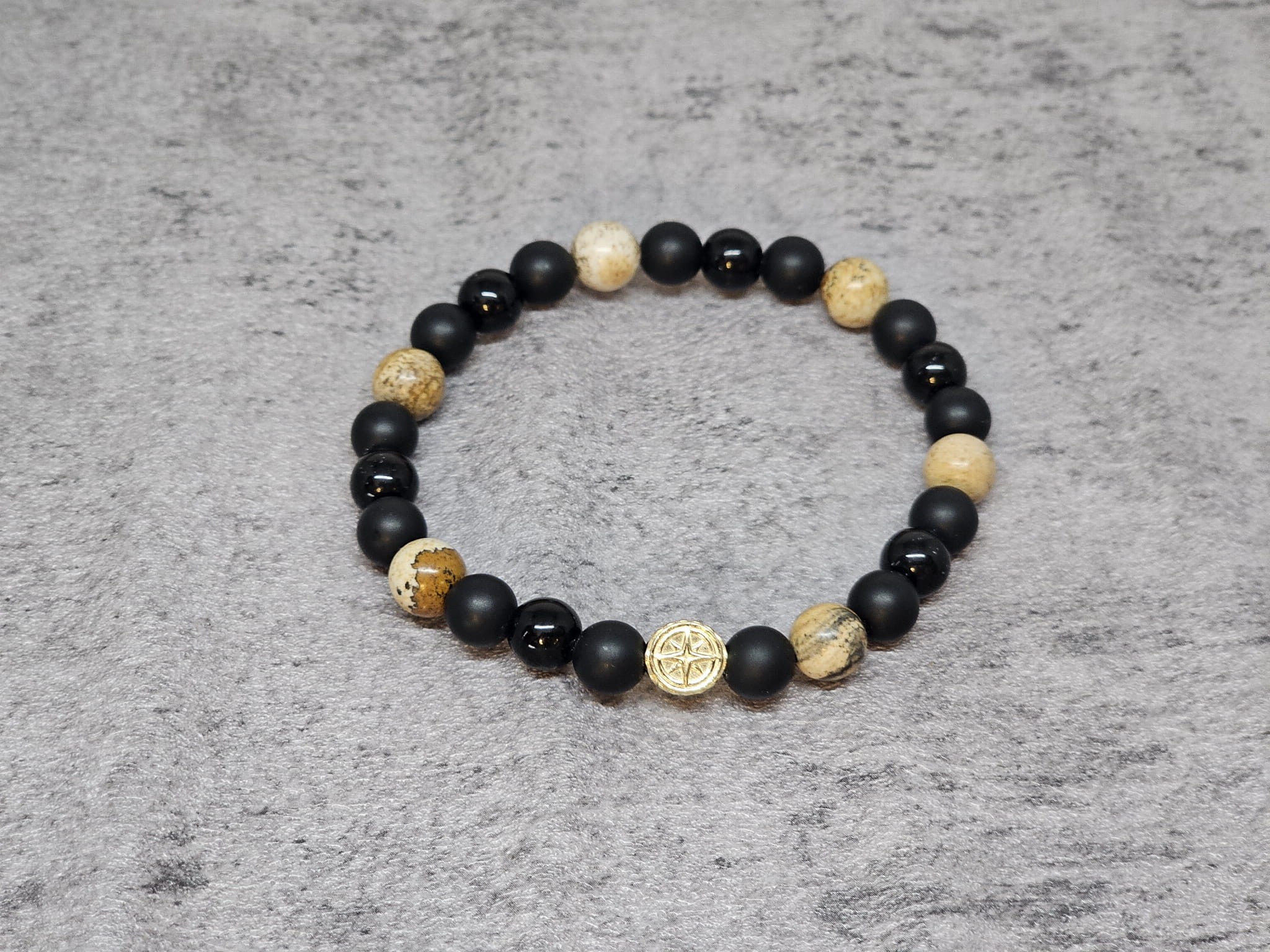 Męska bransoleta z matowym onyksem, antycznym agatem i srebrną różą wiatrów to elegancki dodatek, który łączy surowy urok naturalnych kamieni z klasycznym symbolem róży wiatrów. Może pełnić zarówno funkcję estetyczną, jak i symboliczno-energetyczną.