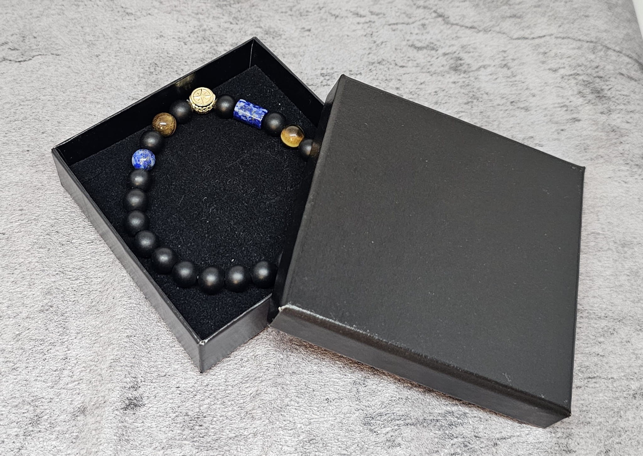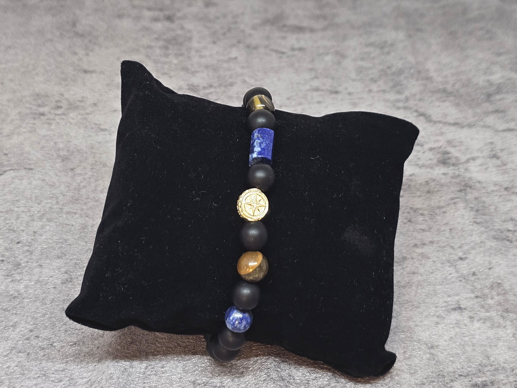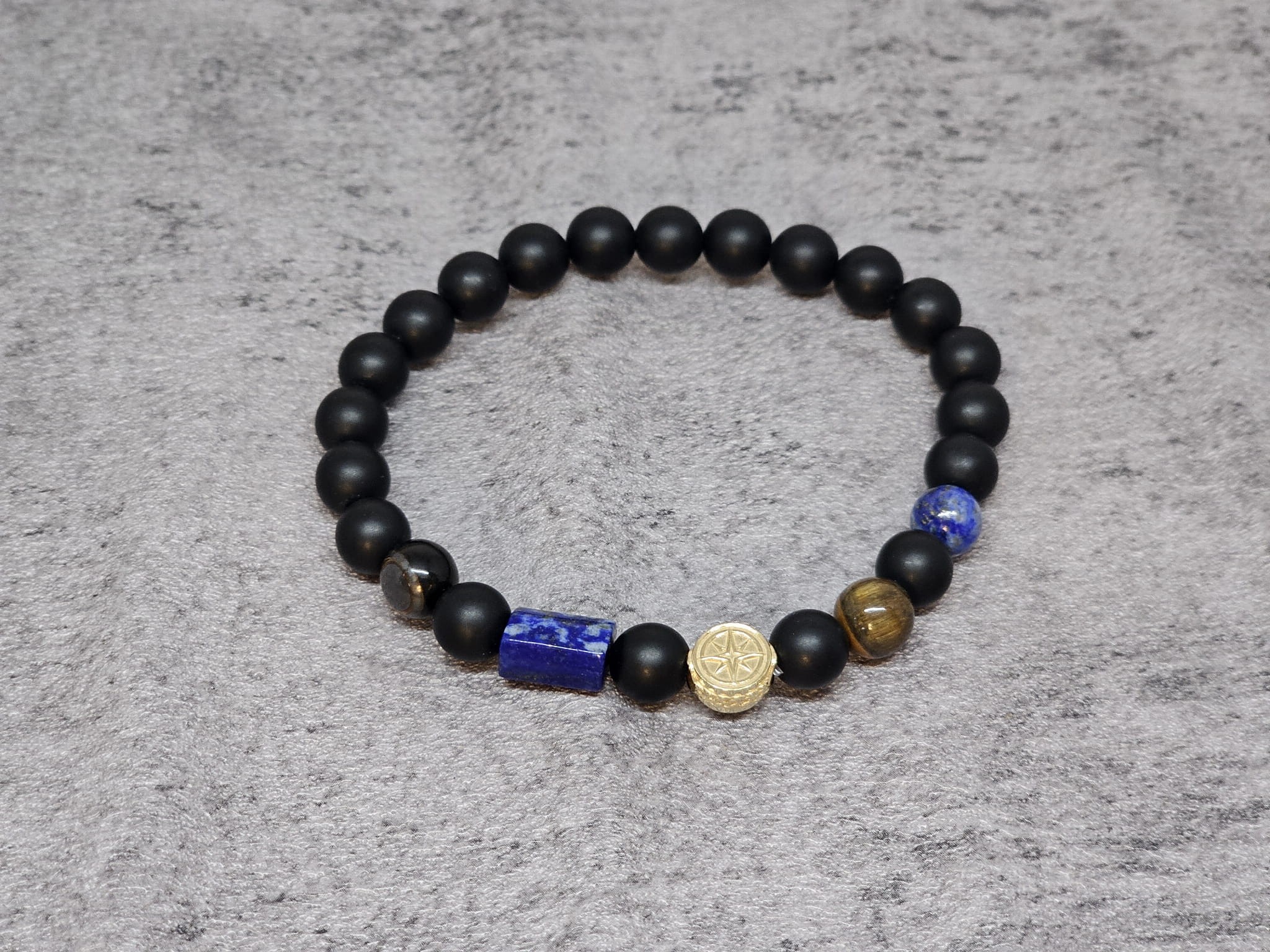 Bransoletka z kamieniami naturalnymi: matowy onyks i tygrysie oko, przeplatana lapis lazuli i srebrną różą wiatrów to elegancki, męski dodatek, który łączy surowy urok kamieni naturalnych z symboliką róży wiatrów. Taka bransoletka nie tylko prezentuje się stylowo, ale również niesie ze sobą głębokie znaczenie duchowe i energetyczne.