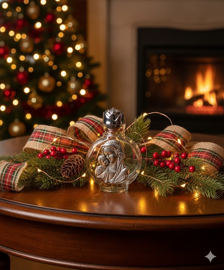 Elegancka i poręczna buteleczka na wodę święconą, wykonana z grubego szkła, z metalowym emblematem Matki Bożej z Dzieciątkiem oraz korkiem w kształcie róży papieskiej. Idealna do sakramentaliów, pielgrzymki, wizyty duszpasterskiej lub domowego ołtarzyka.